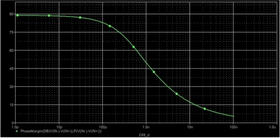 圖 13顯示了當(dāng) Cfilt_d 從 1 pF 增加到 100 nF 時(shí)該電路的相位裕度。相位裕度大幅下降并漸近于 0。當(dāng)輸入端之間的電容約為 1 nF 時(shí),該電路的相位裕度小于 45 度。