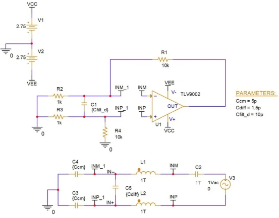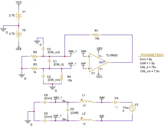 圖 10 TI 的 PSpice 對差分輸入電容器進(jìn)行交流分析電路。