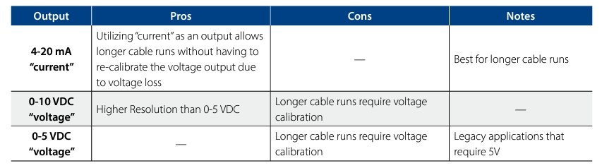 0-5 VDC 和 0-10 VDC 輸出型號(hào)提供與輸入電壓成比例的直流輸出“電壓”(VDC)。如果可以選擇,范圍更廣的 0-10 VDC 型號(hào)會(huì)優(yōu)于 0-5 VDC 型號(hào),因?yàn)?10 伏輸出范圍較大,可提供比 5 伏輸出范圍更高的分辨率測(cè)量。