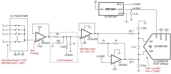 圖 1具有電平轉(zhuǎn)換功能的多路復(fù)用系統(tǒng)驅(qū)動(dòng)高分辨率 ADC 的方式。