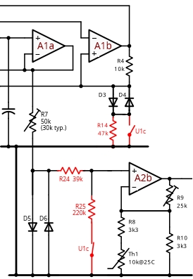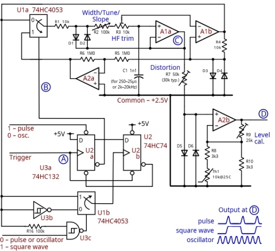 U1c 有兩個(gè)作用。當(dāng)要生成脈沖或連續(xù)正弦波時(shí),它使 R14 短路并打開 R24,從而提供我們的標(biāo)準(zhǔn)工作條件,但在方波模式下,R14 留在電路中,而 R24 接地,這是額外的三波幅度和壓縮所需的。