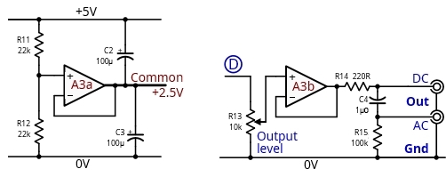 圖 1 中的原理圖給出了電路的基本結(jié)構(gòu),該電路將在第 2 部分中詳細(xì)說明。使用的運算放大器是 Microchip MCP6022,它們是雙路、5 V、10 MHz CMOS RRIO 器件,輸入偏移小于 500 μV。電源為 5 V,中央“公共”軌道來自另一個用作軌道分離器的運算放大器:如圖 4所示,與合適的輸出緩沖器一起顯示。