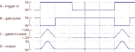 我們通過采用壓扁三角正弦波振蕩器的核心并添加一些邏輯和門控來產(chǎn)生脈沖,以便在觸發(fā)時,它會產(chǎn)生單個周期,這些周期從基線上升到峰值,然后再次回落,遵循余弦曲線。圖 1中的示意圖顯示了基本原理。