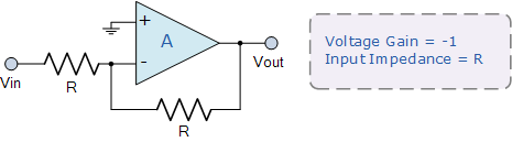 反相器,也稱為反相緩沖器,與先前的電壓跟隨器相反。如果兩個(gè)電阻相等,則反相器不會(huì)放大,但會(huì)反相輸入信號(hào)。輸入阻抗等于R,增益為-1,給出Vout = -Vin。