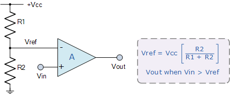 比較器有許多用途,但最常見的是將輸入電壓與參考電壓進行比較,如果輸入電壓高于參考電壓,則切換輸出。如果輸入的電壓比分壓器設(shè)置的參考電壓正電壓Vin>Vref更高,則輸出將更改狀態(tài)。當輸入電壓降至預(yù)設(shè)參考電壓以下且Vin