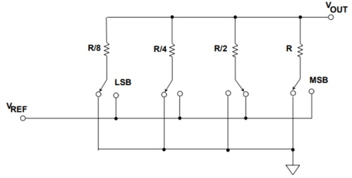數(shù)模轉(zhuǎn)換器 (DAC) 的模擬輸出可以是電壓輸出,也可以是電流輸出。輸出阻抗是任何輸出類型的重要參數(shù)之一。對(duì)于電壓模式輸出,一般會(huì)應(yīng)用二進(jìn)制加權(quán)電阻網(wǎng)絡(luò)進(jìn)行數(shù)模轉(zhuǎn)換。