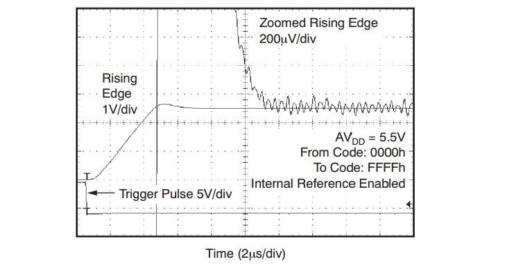 產(chǎn)品說(shuō)明書中針對(duì)較大步長(zhǎng)給出了建立時(shí)間參數(shù)。例如,DAC8568的指定建立時(shí)間為5us,通常針對(duì)的范圍是從?滿量程輸出到?滿量程輸出。