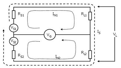 地環(huán)路電流在平衡電路中產(chǎn)生的噪聲電壓:設(shè)由于地電壓VG的影響,在兩根導(dǎo)體中產(chǎn)生了地環(huán)路電流IN1 和 IN2,由于電路是平衡的,因此,IN1 = IN2 ,負(fù)載上的電壓為: VL = IN1 RL1 – IN2 RL2 + IS(RL1 + RL2 )= IS(RL1 + RL2 )