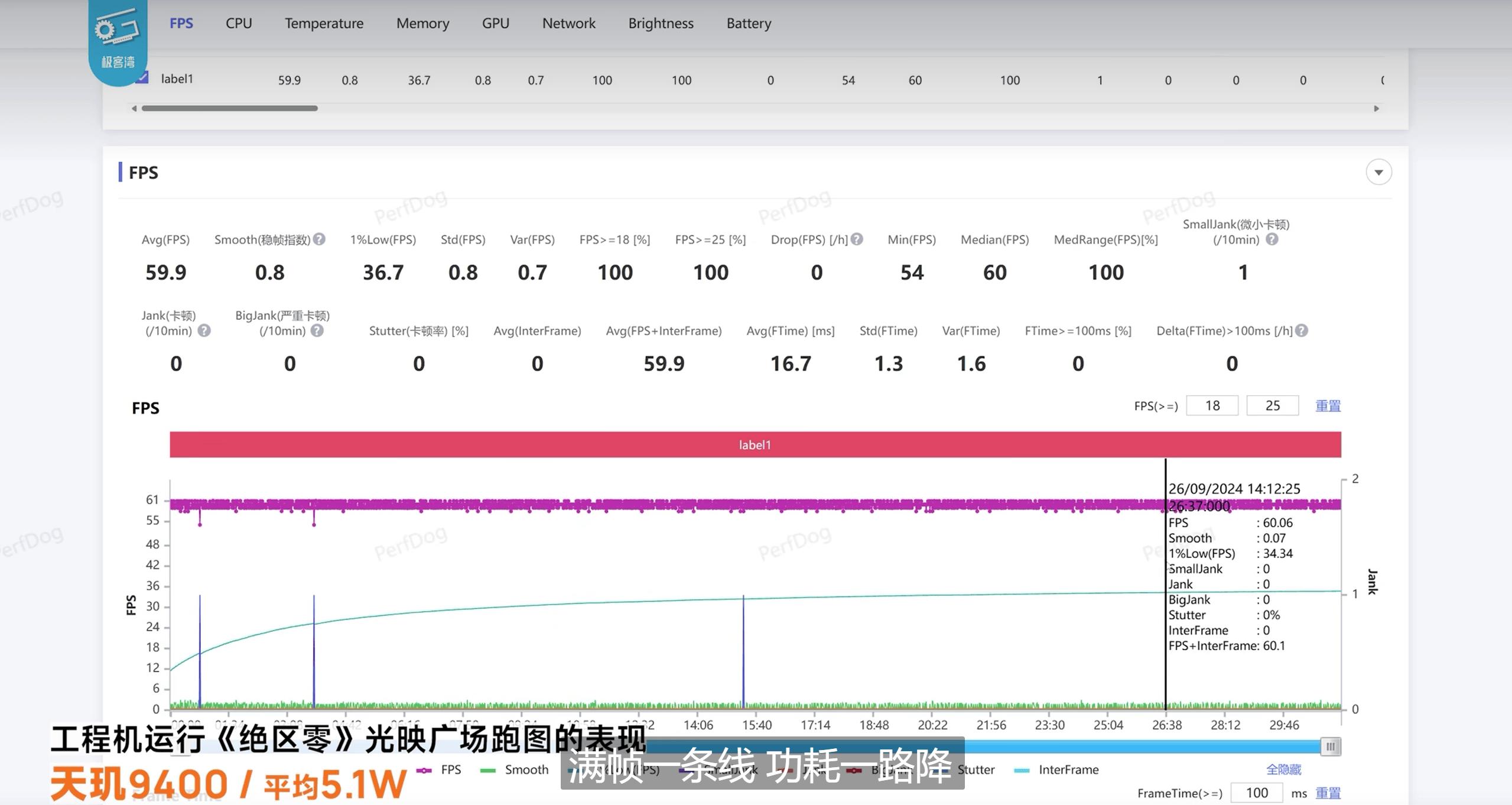 極客灣則測試了天璣9400在《絕區(qū)零》光映廣場跑圖的實際表現(xiàn),可以看到是滿幀一條線,功耗一路降。這款對于現(xiàn)有旗艦手機壓力山大的手機游戲,就這么被天璣9400水靈靈地用低功耗跑到了絲滑滿幀。