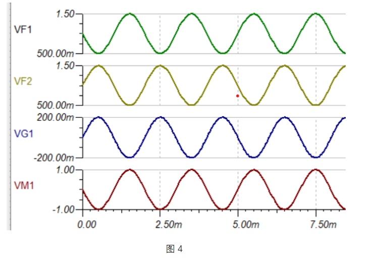 但是如果使用兩顆通用運放來實現(xiàn)差分輸出,需要輸出端各自有 Vshift = 1V 的偏置電壓, 假設(shè) ±200mV 的輸入信號,Gain = 2.5,得到 ±500mV 輸出。因為同相增益 Gain = 1 + Rf / Rg = 3.5,這就需要在第一級運放的同相輸入端產(chǎn)生 1 / 3.5 = 285.7mV 的電壓。如下所示,可以看到結(jié)果和 SC7516 是一致的,但是設(shè)計上不如直接使用一顆全差分運放方便。