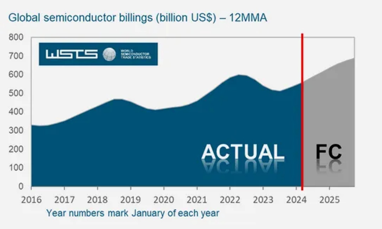 隨著全球人工智能(AI)和高性能運(yùn)算(HPC)需求的增長(zhǎng),以及智能手機(jī)、個(gè)人計(jì)算機(jī)、服務(wù)器、汽車等市場(chǎng)的需求回暖,半導(dǎo)體產(chǎn)業(yè)正迎來新一輪增長(zhǎng)浪潮。6月份,世界半導(dǎo)體貿(mào)易統(tǒng)計(jì)組織(WSTS)上調(diào)了對(duì)全球半導(dǎo)體市場(chǎng)的預(yù)期,預(yù)計(jì)2024年將實(shí)現(xiàn)16%的增長(zhǎng),市值估值達(dá)到6110億美元。據(jù)悉,這一增長(zhǎng)主要得益于過去兩個(gè)季度的強(qiáng)勁表現(xiàn),尤其是在計(jì)算終端市場(chǎng)。與之形成對(duì)比的是WSTS在今年初曾預(yù)測(cè)2024年全球半導(dǎo)體市場(chǎng)的同比增長(zhǎng)率為13.1%,總規(guī)模至5883.6億美元。無獨(dú)有偶,WSTS更是預(yù)計(jì)2024年和2025年市場(chǎng)都將實(shí)現(xiàn)強(qiáng)勁增長(zhǎng)。
