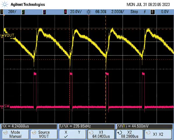 電感電流紋波的下降也會在轉(zhuǎn)換器的輸出電壓中表現(xiàn)出來。輸出電壓紋波變得更加嘈雜,這可能會影響敏感負載并降低EMI性能。此影響可以從圖5中看出。