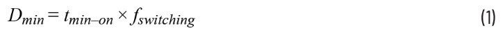 設(shè)計人員常常選擇較高的開關(guān)頻率以減小電路板尺寸,但由于開關(guān)損耗增加,能效比會降低。然而,當器件具有高頻率和高降壓比時,占空比會被迫變小,并可能降至最小占空比值以下。最小占空比如公式1所示。