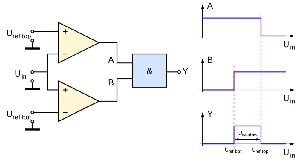 窗口 比較器,也稱為窗口檢測電路或雙邊緣限制檢測器,用來確定輸入是否是兩個(gè)精確的基準(zhǔn)電壓之間??梢杂脙蓚€(gè)平行的比較器建立窗口比較器,以確定是否有信號(hào), 在…中 ,位于兩個(gè)基準(zhǔn)電壓之間 最上面, 以及你 機(jī)器人 .如果在引用之間的窗口中有信號(hào),則輸出量很高;如果沒有,則輸出量很低。每個(gè)比較器將輸入信號(hào)與一個(gè)引用進(jìn)行比較。輸出通過邏輯門發(fā)送,如輸出數(shù)字信號(hào)的門( 圖3)。窗口探測器的應(yīng)用范圍從電平傳感器、電池電壓監(jiān)視器和測試系統(tǒng)到各種工業(yè)過程報(bào)警裝置。