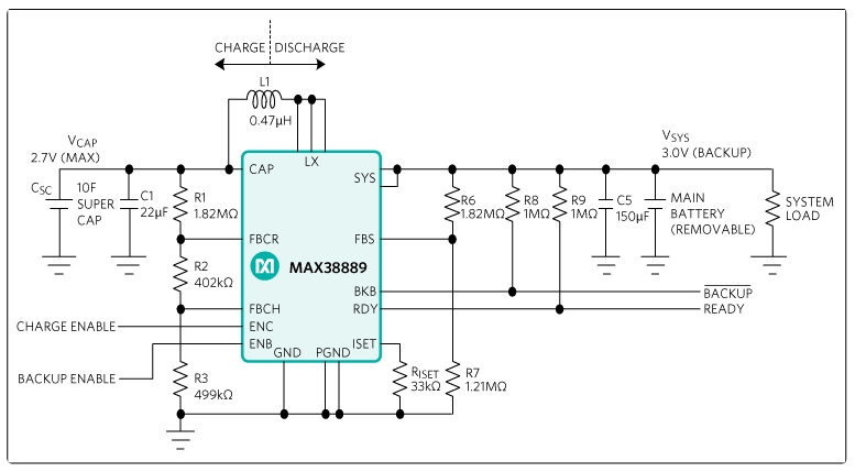 該 IC 旨在在超級電容器和系統(tǒng)供電軌之間傳輸電力。當(dāng)主電池存在且高于充電所需的最低系統(tǒng)電壓時(shí),MAX38889 會為超級電容器充電。一旦超級電容器充電完畢,電路就會將超級電容器保持在就緒狀態(tài)。當(dāng)主電池被移除時(shí),MAX38889 從超級電容器獲取電力并將系統(tǒng)電壓調(diào)節(jié)至設(shè)定的備用電壓。