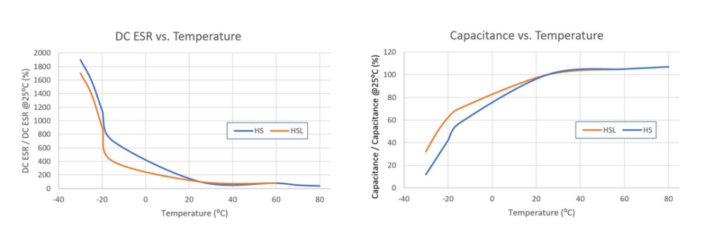 與所有電子元件一樣,性能隨溫度變化是重要的設(shè)計(jì)考慮因素。雖然具體情況因供應(yīng)商和型號而異(圖 3),但可以表明同一供應(yīng)商(伊頓)的兩個混合超級電容器系列的 ESR 和電容隨溫度變化的性能。他們的 HSL 超級電容器針對較低的溫度進(jìn)行了優(yōu)化,可低至 -25°C,而 HS 超級電容器的范圍則擴(kuò)展到 +85°C,并針對較高的溫度進(jìn)行了優(yōu)化。