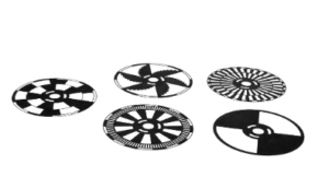 正如使用不同數(shù)目牙齒的齒輪來跨越大范圍的機(jī)械動力范圍一樣,也可使用不同圖案的切盤來覆蓋大范圍的頻率范圍( Figure 3) .金屬葉片是光化學(xué)蝕刻,為葉片提供緊密的公差,以確保低相位的振蕩光切割信號。