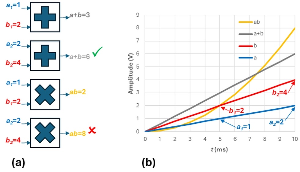 線性度的測試是一個(gè)系統(tǒng)是否堅(jiān)持疊加原理,這反過來又要求系統(tǒng)表現(xiàn)出加性和均勻性。如果輸入的話 A 產(chǎn)出 X 以及輸入 b 產(chǎn)出 y ,然后同時(shí)申請 A + b 會產(chǎn)生 X + y .
