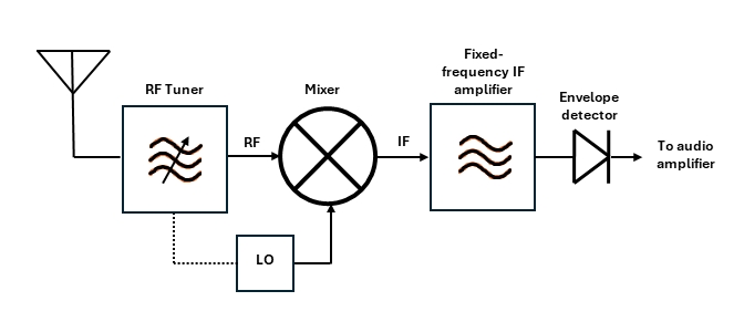 至少從電報(bào)時(shí)代開始。 圖1 展示了超外差調(diào)幅(AM)無線電的簡化圖。在這里,一個(gè)混頻器向下轉(zhuǎn)換射頻信號到一個(gè)固定的中間頻率(中頻),由一個(gè)可變的本地振蕩器(LO)耦合到一個(gè)射頻調(diào)諧器。該電路在1917年獲得專利,至今仍在使用。