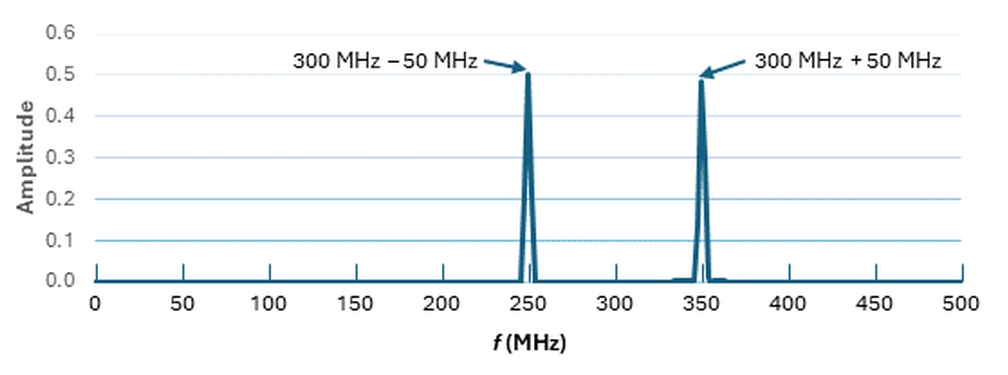黑色痕跡的頻率含量不是很明顯,所以我們將借用上一系列的快速傅立葉變換(FFT)。?第4部分 包括整個(gè)系列的摘要)并仔細(xì)研究。 圖4 顯示混合器已取代了50兆赫和300兆赫的輸入信號,其信號代表這些信號的和(350兆赫)和差(250兆赫)。