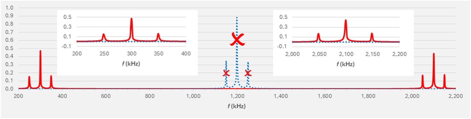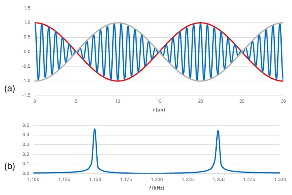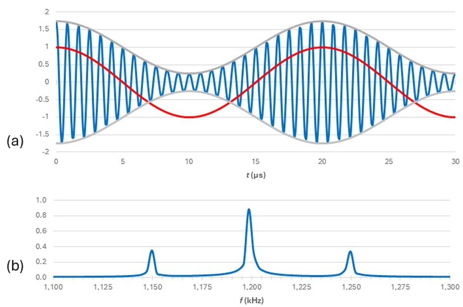 在這里, f M 我們要用的信號來調(diào)節(jié)載波 f C . 圖2a 顯示調(diào)制波形(藍色) f C 1,200千赫和 f M 等于50千赫(紅色,灰色曲線表示負 f M ). 圖2B 顯示被調(diào)制信號的快速傅立葉變換(FFT)。這里,原來的1200千兆赫載波器并沒有出現(xiàn)--只有1,150千兆赫和1,250千兆赫的邊帶--也就是說,從1,200千兆赫到50千兆赫。