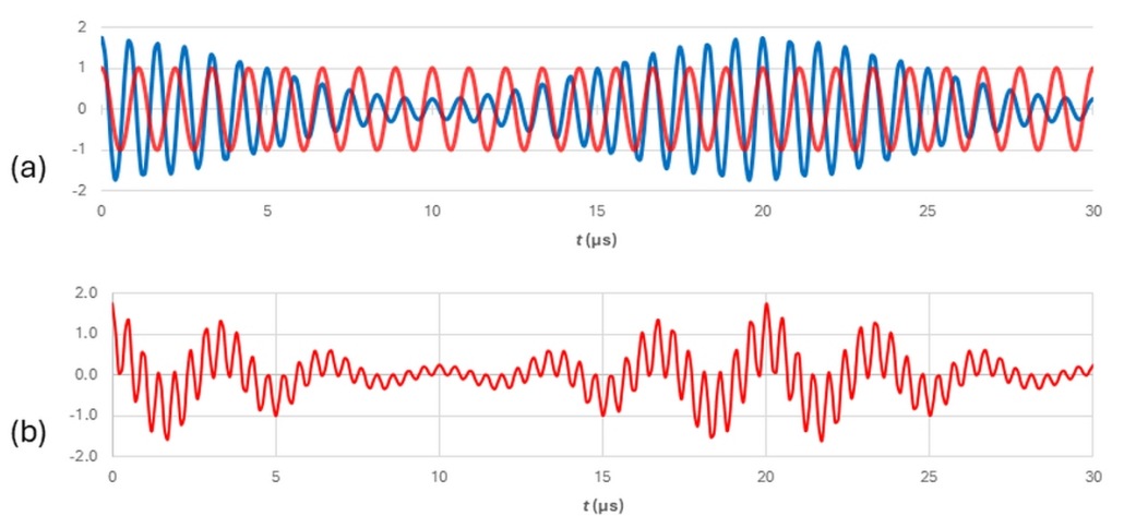 圖4結合圖3調(diào)制藍色波形和900-KZ紅色波形(A)在一個混合器的波形代表產(chǎn)品(B)。