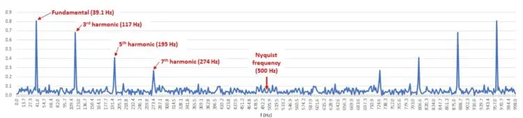 現(xiàn)在,我們可以在E欄中繪制FFT的大小。F欄頻率( 圖5 )。FFT顯示了整個頻率范圍內(nèi)的噪聲,但在39.1-赫茲的基頻加上第三、第五和第七次諧波上有明顯的峰值。請注意,FFT在500赫茲的頻率(或稱折疊頻率)以上創(chuàng)建了這些脈沖的鏡像圖像。這些別名可能會被丟棄,在隨后的圖表中,我將只包括不超過尼奎斯特頻率的頻率。