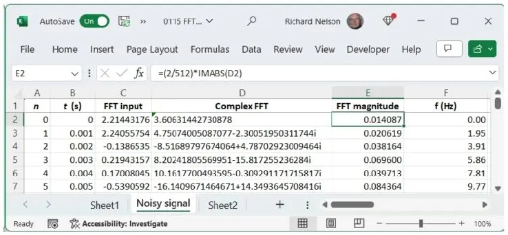 圖2 提供詳情;只需遵循下列九個步驟: 紅色的 .請注意,在B欄中,我們輸入數(shù)據(jù)樣本的時間,從而映射樣本 n 按時 t .然后我們將512個樣本數(shù)據(jù)點(diǎn)插入到C列中,作為DFT輸入。