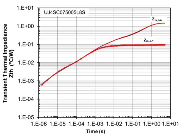SiC 器件的最大結(jié)溫 (T J,Max ) 值及其額定電流基本上由所用的封裝決定。盡管 SiC 本身具有在超過(guò) 500°C 的溫度下安全運(yùn)行的能力,但在共源共柵 SiC FET 的 JFET 中,最高溫度限制為 175°C。這一限制仍然允許 SiC FET 在從較低溫度啟動(dòng)時(shí)處理明顯高于其連續(xù)額定值的瞬態(tài)峰值電流。特定芯片和封裝(例如上述 SiC FET 器件)的瞬態(tài)熱阻抗圖概述了這些特性,如圖1所示。