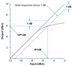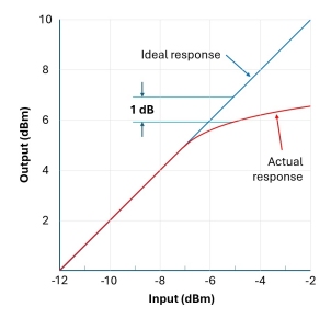 A: 如果您正在使用現(xiàn)代矢量網(wǎng)絡(luò)分析器(VNA),它可能會(huì)自動(dòng)測(cè)量壓縮點(diǎn)。如果您正在手動(dòng)進(jìn)行測(cè)量或正在使用先前獲得的數(shù)據(jù),那么創(chuàng)建一條表示理想響應(yīng)減去1分貝的線是很有幫助的。 圖4 )。這條線與P1db點(diǎn)上的紅色測(cè)量響應(yīng)曲線交叉,幫助您快速定位OP1db和IP1db,并減少錯(cuò)誤解釋的可能性。