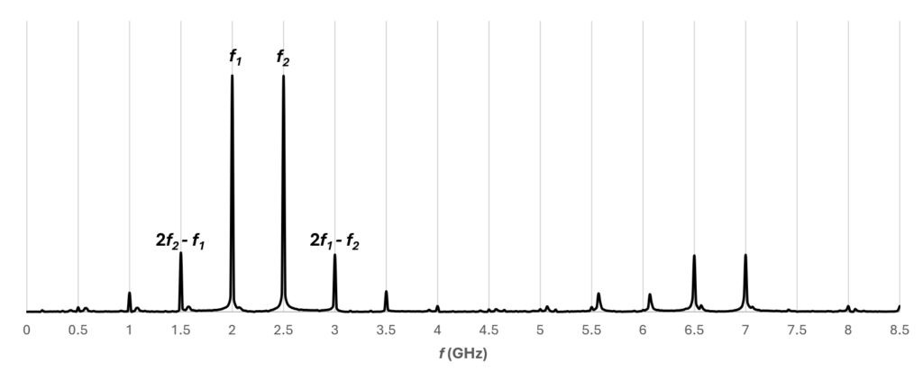 在?第一部分中 ,我們研究了1db壓縮點(diǎn),它是射頻功率放大器等設(shè)備的優(yōu)點(diǎn)。一個(gè)附加的規(guī)范,三階截取點(diǎn),簡稱IP3或TEI,特別適用于具有多個(gè)輸入頻率的電路。例如,假設(shè)放大器和兩個(gè)頻率為 f 1 = 2 GHz and f 2 =2.5千兆赫。由于非線性,該電路產(chǎn)生具有各種干擾頻率的輸出頻譜,如 圖1 .在一個(gè)?先前關(guān)于互調(diào)失真的帖子 ,我們注意到低及高側(cè)三階互調(diào)產(chǎn)品2 f 1 – f 2 和2 f 2 – f 1 因?yàn)樗鼈兘咏久?難以過濾,所以可能會(huì)特別麻煩。選擇一個(gè)具有高IP3評級(jí)的放大器或其他設(shè)備可以最小化這些產(chǎn)品的水平。