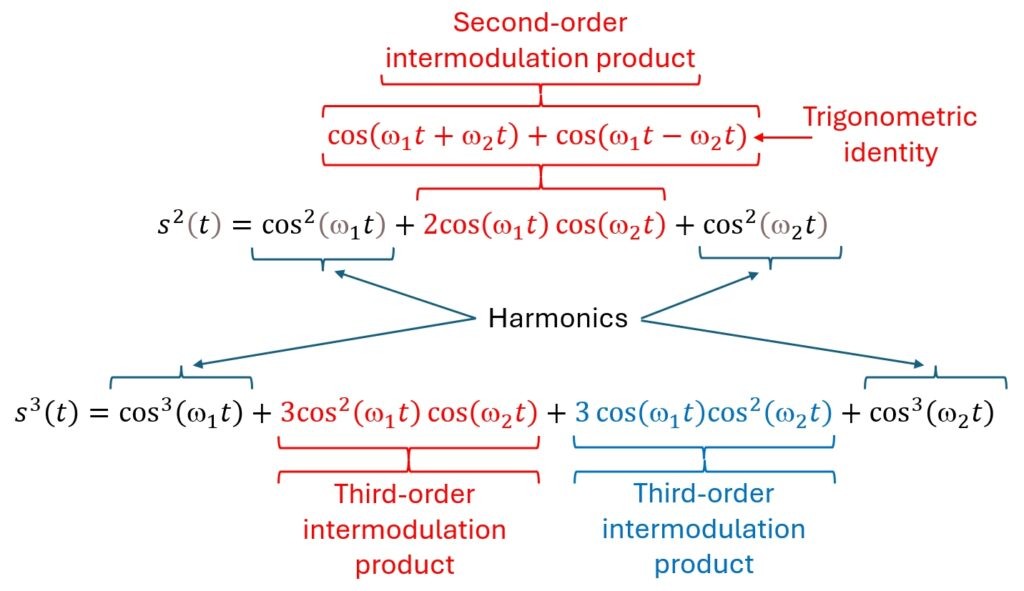 圖2 顯示擴(kuò)展和注釋的 s 2 t .在這里,指揮官們 2 術(shù)語代表基本輸入信號(hào)的第二次諧波。中間術(shù)語--紅色的互調(diào)產(chǎn)物--可以用?三角法同一性 如圖所示,在這里我們可以看到互調(diào)產(chǎn)品代表了輸入頻率的總和和差。
