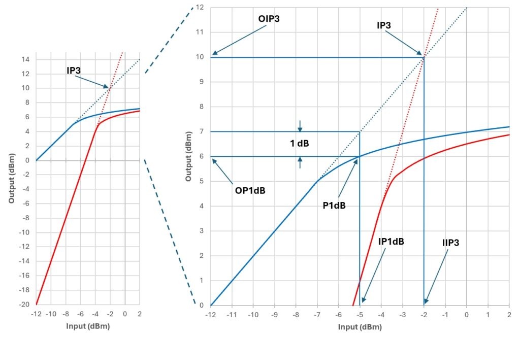 在這里, C 1 s 我們的條件是 f 1 和 f 2 圖1), C 3 s 3 代表第三級?互調 產品。注意 C 3 s 3 隨著輸入功率的增加,對POO(S)的貢獻線性增加,而三階互調產品的貢獻則以立方的方式增加。因此,即使 C 3 s 3 相對于低投入功率水平的C1來說,期限是很小的,隨著功率的增加,它將會更快地增長。在某種理論上, C 3 s 3 任期相等 C 1 s .這一點是IP3。當然,在現(xiàn)實生活中,我們無法到達IP3--放大器將首先進入壓縮。