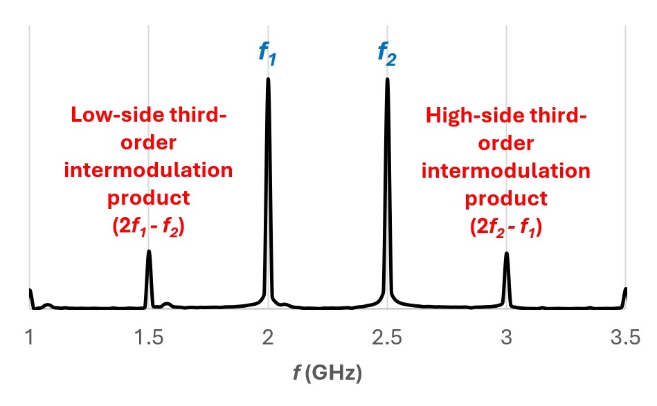 在?第一部分中 在這個系列中,我們討論了1-db壓縮點作為設備線性度的一個優(yōu)點。在?第2部分里面 ,我們檢查了一個增加兩個頻率的基本輸入信號的電路。 f 1 = 2 GHz and f 2 =2.5千兆赫。由于非線性,電路產生干擾,主要形式為低面和高面三階互相調制產品2 f 1 – f 2 和2 f 2 – f 1 , respectively ( 圖1)。三階攔截點,簡稱IP3或toi,表示設備如何很好地限制這種干擾。