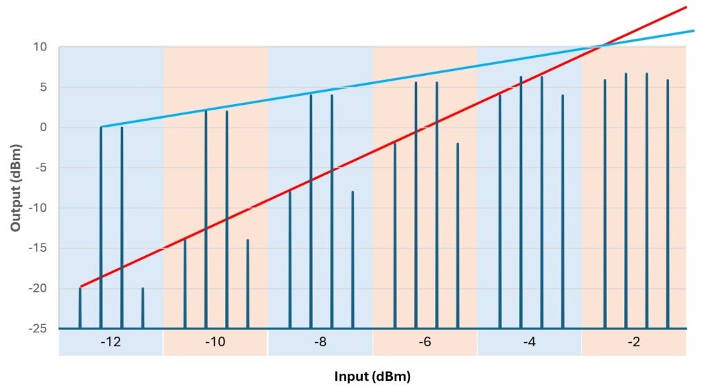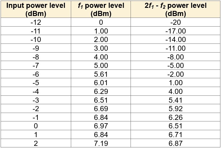 我們將從反應曲線的線性部分推斷出來。我們可以從一系列不同輸入功率級別的輸出頻譜快照開始,如圖所示: 圖2 .趨勢線連接著 f 1 (藍色)和2 f 1 – f 2 (紅色)在增益壓縮出現(xiàn)之前,輸入水平大約為-6 f 1 and -2 dBm for 2 f 1 – f 2 . (Because f 1 相等的 f 2 在數(shù)量上,低面和高面產品在數(shù)量上相等,我們可以忽略 f 2以及分析的高端產品。)