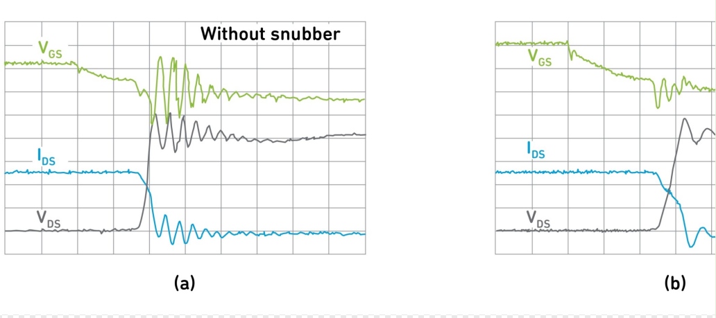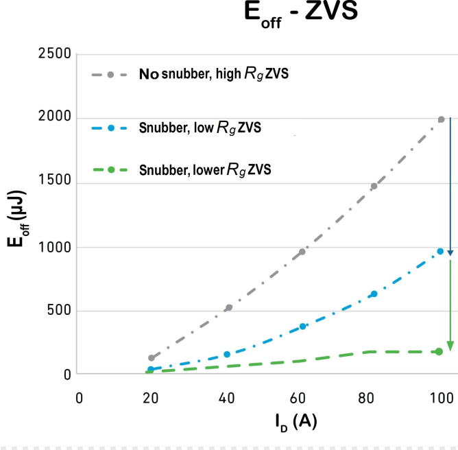 在 ZVS 軟開關應用中,添加的漏極至源極緩沖電容器不會產生任何導通損耗。漏極和源極之間的額外緩沖電容與低柵極電阻相結合,在關斷 d V /d t轉換期間在互補續(xù)流器件中提供更高的位移電流。這可以進一步減少關斷電流和電壓之間的重疊,與僅使用高柵極電阻相比,可大大降低關斷開關損耗。通過這種方法,我們可以控制V DS振鈴,而不會犧牲器件開關速度,而如果要使用高柵極電阻策略,則需要犧牲器件開關速度。圖 3顯示了如何使用緩沖器來減少振鈴。