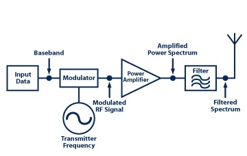 圖1:功率放大器是采用低頻率射頻信號(hào)并提高其功率的元件,不增加任何對(duì)格式、調(diào)制或其他因素的改變;有時(shí)需要在源(PA)和負(fù)載(天線)之間顯示濾波器,以盡量減少由于PA不完善而產(chǎn)生的不希望的信號(hào)。
