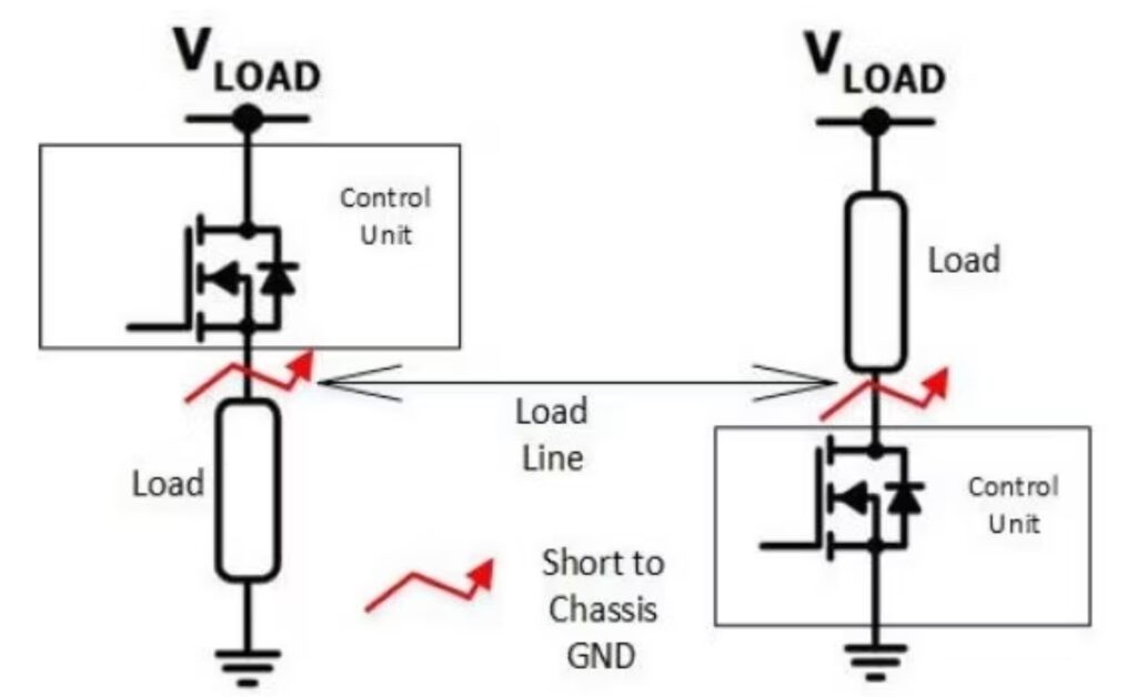 汽車系統(tǒng)中的驅(qū)動功率MOSIFT有所不同,根據(jù)應(yīng)用情況采用了高水平和低水平的驅(qū)動。低面驅(qū)動器位于負(fù)載和地面之間,高面驅(qū)動器位于負(fù)載和電源電壓之間。兩者之間的一個重要區(qū)別是它們對故障條件的響應(yīng),特別是在電源轉(zhuǎn)換應(yīng)用中最常見的故障模式短路。在汽車應(yīng)用程序中,短地面比短供應(yīng)更有可能。供電電壓通常用一根電線來傳遞,而接地則通過幾乎無處不在的金屬板傳遞。對于一個高端司機(jī)來說,短地面故障將使輸出縮短到地面,并需要保護(hù)電路,而短地面故障與低地面司機(jī)啟動負(fù)載,可能不需要相同的保護(hù)( 圖4 )。供應(yīng)故障則相反.一個被縮短到需要保護(hù)的低身驅(qū)動器和高側(cè)負(fù)載將永久打開,可能也需要保護(hù),但不同類型的保護(hù) .