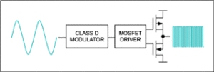 D級放大器 (有時被稱為數(shù)字放大器,盡管這是誤導性的)是一種有點違背直覺但非常有效的拓撲結構。它的功能是非線性的開關放大器,而不是其他類的線性或準線性方法?;顒釉词峭耆蜷_的,要么是完全關閉的,脈沖寬度由輸入信號調(diào)制, 圖5 .輸出波形的開關頻率遠遠高于需要放大的最高音頻信號。