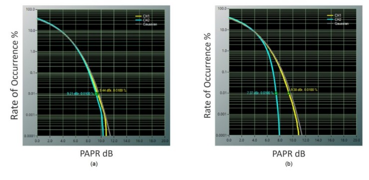 圖8峰的光壓縮(a)在PAPR中的差異為0.6db,而(b)較重的峰壓縮則使PAPR增加到3db。
