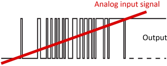 圖4 Delta-sigma調(diào)制器的輸入和輸出;較高的正輸入信號(hào)在輸出端產(chǎn)生的時(shí)間百分比較高,而較低的負(fù)輸入信號(hào)在輸出端產(chǎn)生的時(shí)間百分比較低。