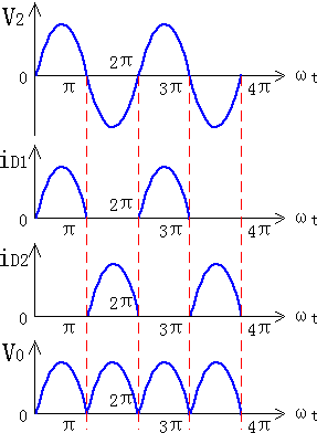 (2)整流二極管工作原理:在交流電正負(fù)半周都有同一方向的電流流過RL,4只二極管中2只為一組,兩組輪流導(dǎo)通,在負(fù)載上得到全波脈動的直流電壓和電流。