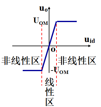 由于運(yùn)算放大器Aod=∞,微小的差分輸入(ud=up-un)就可能使運(yùn)放輸出達(dá)到飽和:uo=Aod(up-un),uo=+uom或-uom。這是我們理解電壓比較器的基礎(chǔ)。運(yùn)放的電壓傳輸特性如下圖所示: