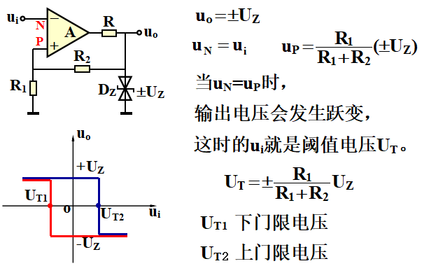 滯回比較器電路,有兩個(gè)閾值電壓UT1和UT2,輸入信號ui變化過程中,先經(jīng)歷一個(gè)UT,到達(dá)第二個(gè)UT時(shí),輸出電壓發(fā)生變化。