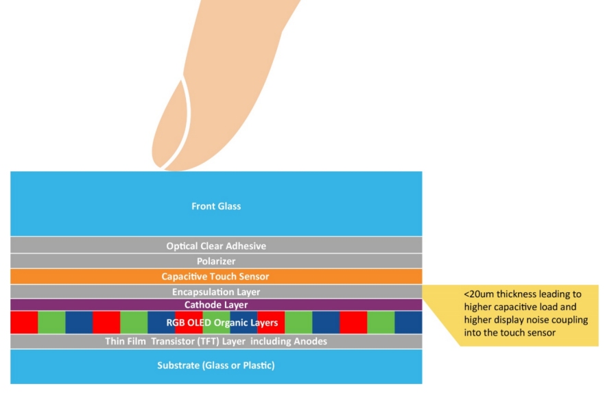 盡管采用On-cell技術(shù)可以讓OLED顯示屏變得更薄,但也給觸摸屏控制器帶來(lái)了新的挑戰(zhàn)。這是因?yàn)橛|摸電極變得更加靠近陰極層和顯示像素(見(jiàn)圖1:汽車(chē)On-cell觸摸OLED堆疊結(jié)構(gòu))。采用On-cell設(shè)計(jì)后,觸摸電極對(duì)地的電容負(fù)載現(xiàn)在變得更高。盡管手指觸摸電容大小沒(méi)有改變,但手指觸摸的靈敏度有所降低。