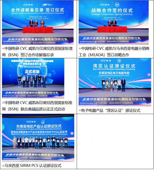 會議現(xiàn)場,中國電研CVC威凱與印度尼西亞國家標準局(BSN)、馬來西亞電器分銷商公會(MEADA)分別簽署了合作諒解備忘錄與戰(zhàn)略合作協(xié)議。會上還舉辦了中國電研CVC威凱&印度尼西亞國家標準局(BSN)聯(lián)合高端品質認證啟動儀式以及電子電器產品“灣區(qū)認證”、馬來西亞SIRIM PCS認證頒證儀式。通過與東南亞地區(qū)相關機構在認證認可領域的交流與合作,越來越多優(yōu)秀的企業(yè)走出國門,為推動區(qū)域經貿合作和高質量發(fā)展做出了積極貢獻。