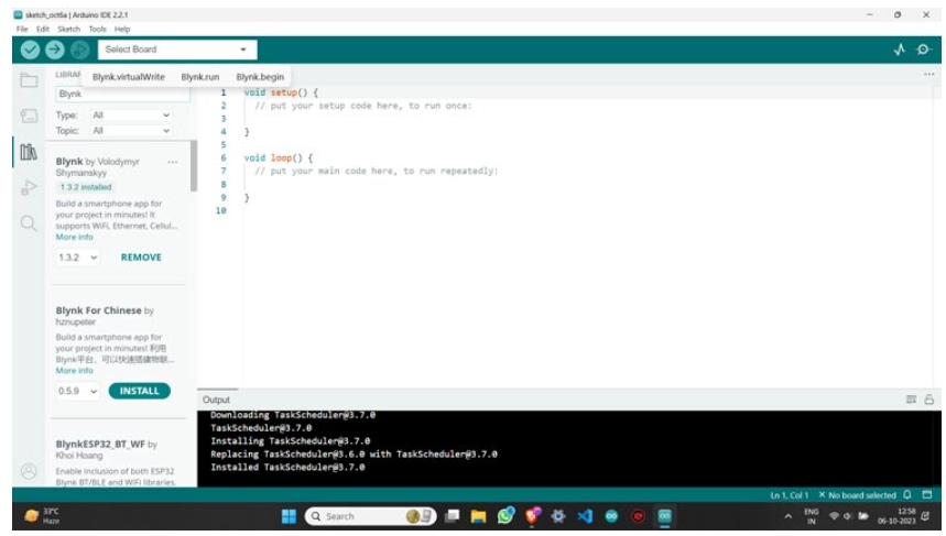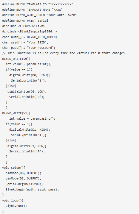 在設(shè)置函數(shù)中,將數(shù)字引腳D0和D1配置為輸出引腳。啟動串行通信,并使用提供的WiFi憑據(jù)和認證令牌連接到Blynk服務(wù)器。