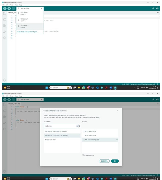 步驟3:使用USB線將您的NodeMCU ESP8266板插入PC,然后選擇您的板和端口。