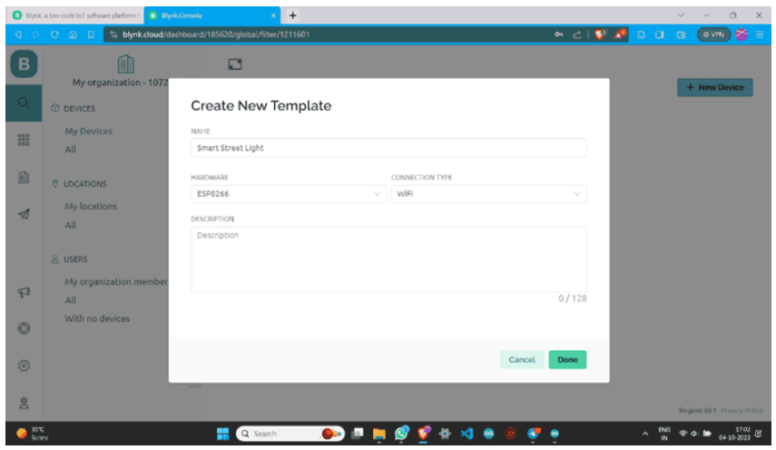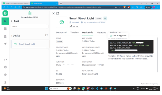 步驟4:創(chuàng)建新模板后,您將在blynk帳戶上看到以下屏幕。