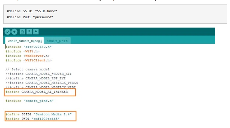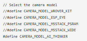 在代碼的開頭,您將找到特定相機模型硬件的定義。默認情況下,將有CAMERA_MODEL_ESP_EYE選擇,但我們的模塊使用CAMERA_MODEL_AI_THINKER。因此,對前面選擇的模型進行注釋,并取消對CAMERA_MODEL_AI_THINKER模型的注釋。